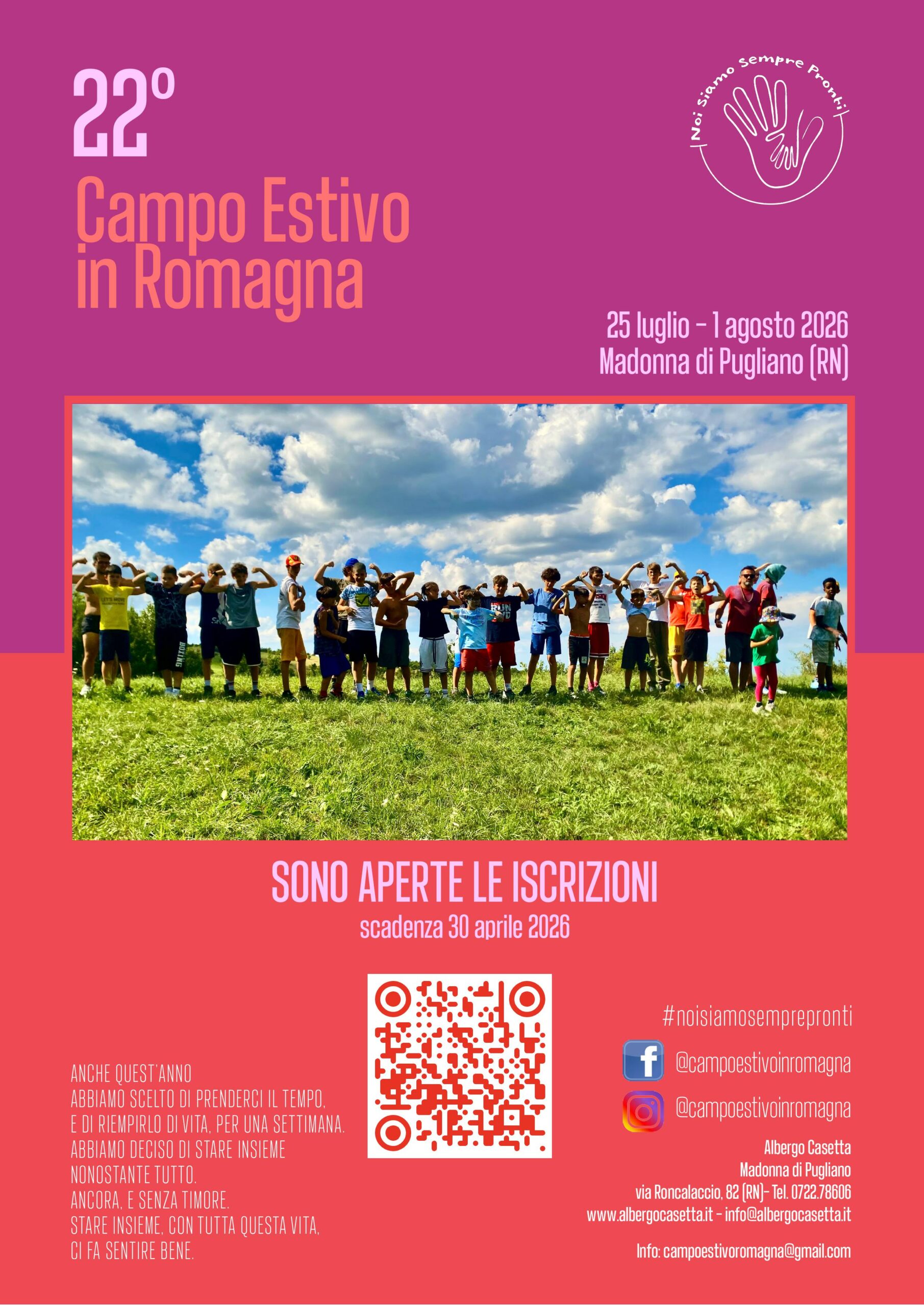 Il Campo si terrà da sabato 25 luglio a sabato 1° agosto presso l’Albergo Casetta, a Madonna di Pugliano (RN): un luogo ormai simbolo del nostro progetto, dove i ragazzi possono vivere una settimana all’insegna dell’autonomia, del divertimento e della scoperta.